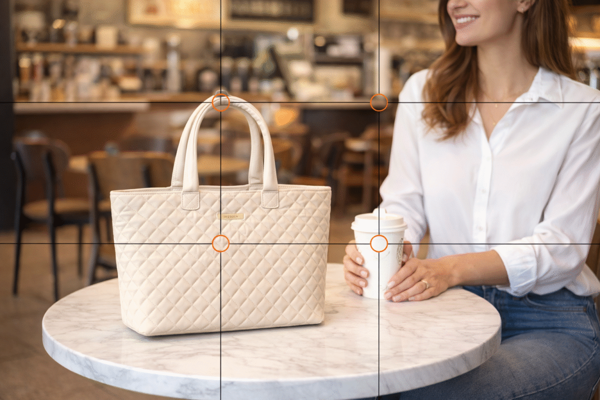 When styling or photographing bags, place key elements (handles, logos) along imaginary thirds lines for dynamic appeal.