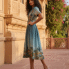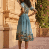 a fluid crepe blend. Featuring a washed teal base with a scenic Tuscany print, this dress tells a story across the bodice and hem, highlighted by rustic trees, cypress silhouettes, and architectural facades.
