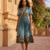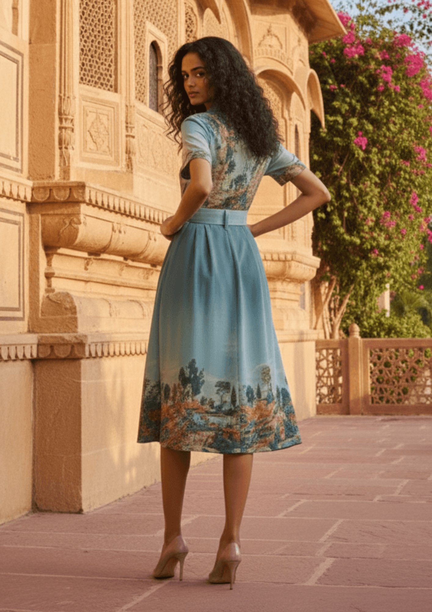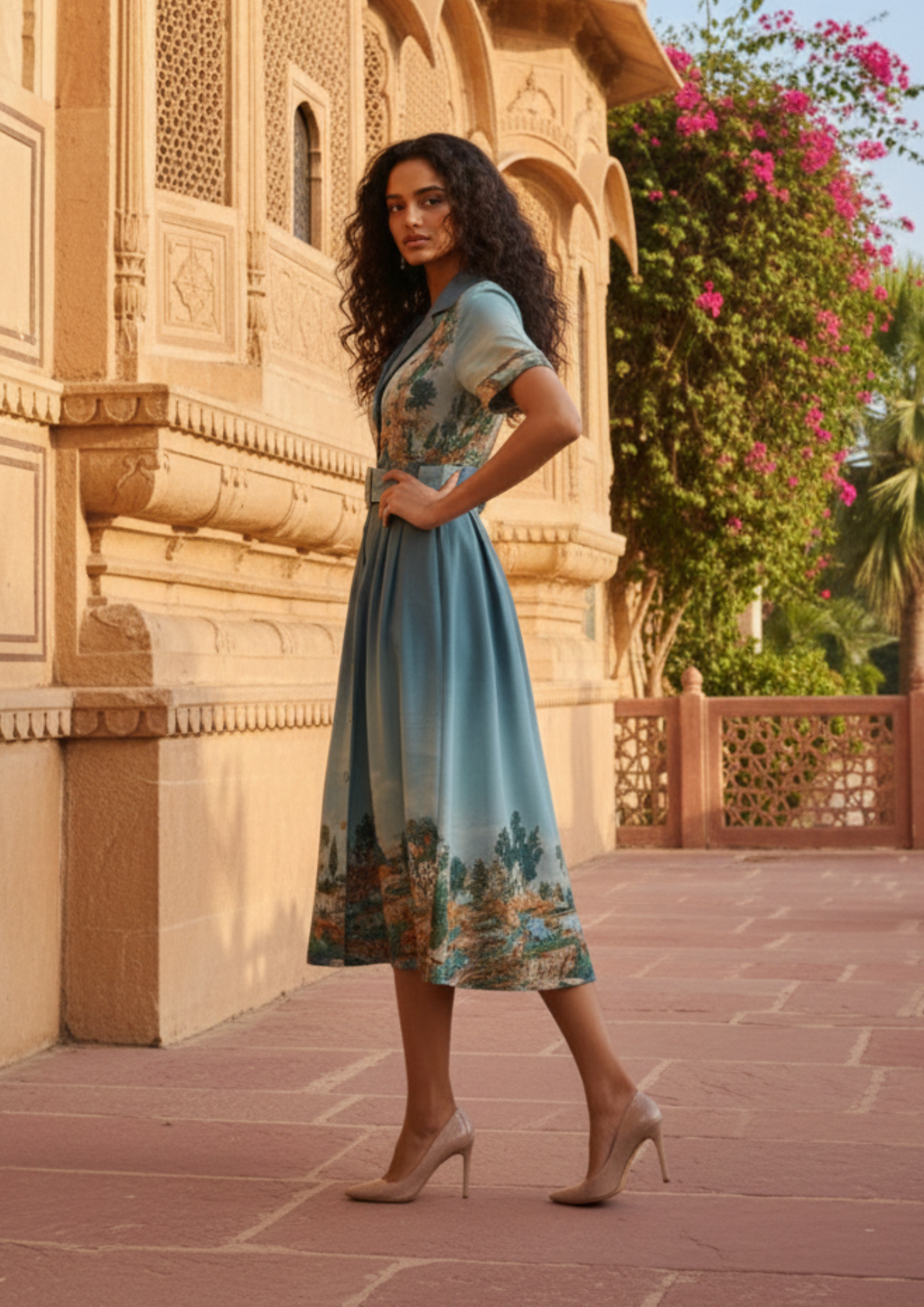 Notch Collar Midi Dress in Teal Blue Scenic Tuscany Print Crepe Dress with Belted Waist & Button Down Front Elegant Women’s Day to Evening Outfit
