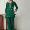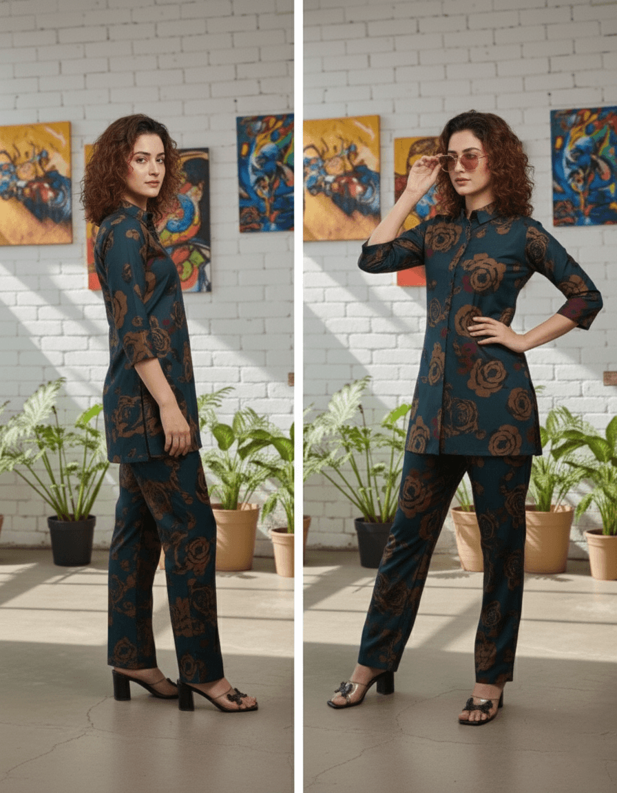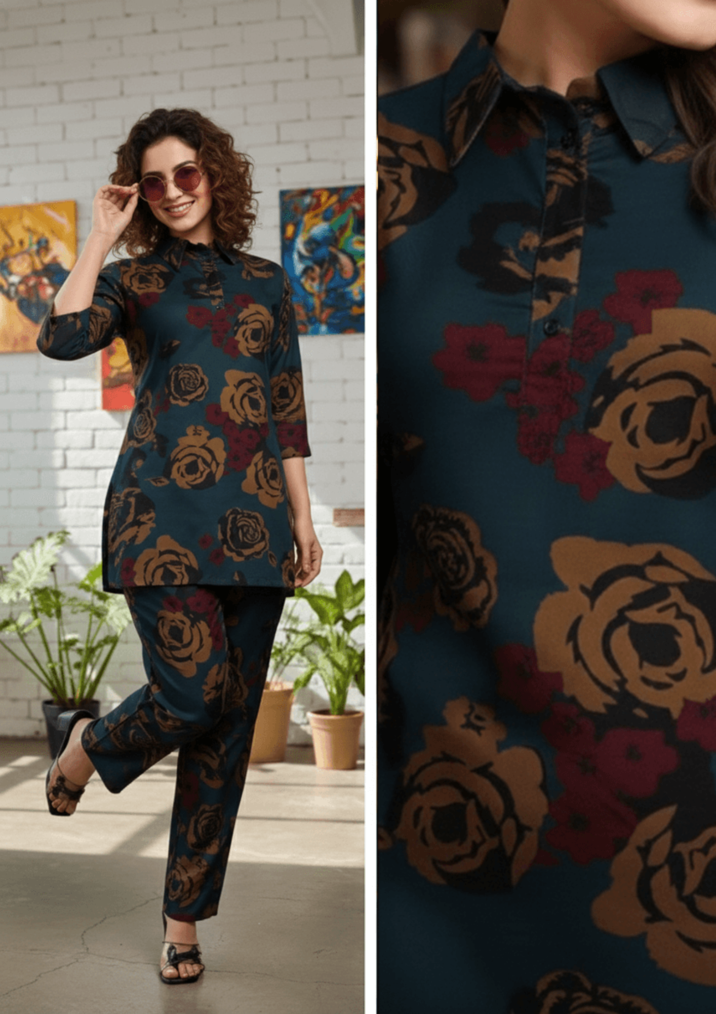 Elevate your everyday style with this soft and breathable rayon co-ord set. The aqua blue printed shirt pairs perfectly with the relaxed track pants for a comfortable yet stylish casual look. Designed with a round neckline, long sleeves, and coordinated prints, this set offers a modern blend of ease and elegance. Complete with a matching scarf, it’s a versatile outfit ideal for day outings, relaxed gatherings, or travel.